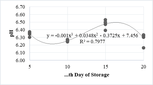 Furthermore, the orthogonal polynomial test was conducted to determine the regression pattern of pasteurized milk storage treatment with the addition of butterfly pea flower extract to the pH value. The results showed that it was significantly different in cubic regression. The cubic equation is the best estimator equation, namely y = –0.001x3+0.0348x2– 0.3725x+7.456 with a determination rate of 0.798. Duration of storage at low temperature until day 20 had an effect of 79.8% on the total pH value of pasteurized milk with the addition of butterfly pea flower extract.
