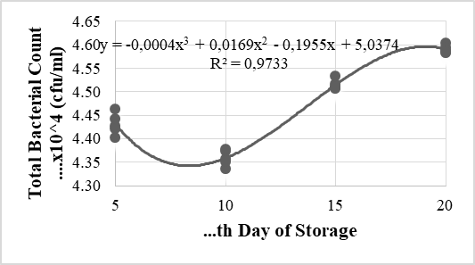 Based on the graph of orthogonal polynomial test results (Figure 1) shows a significant difference in cubic regression with the equation y = –0.0004x3+0.0169x2–0.1955x+5.0374 with a high level of determination of 0.973. The Length of storage at low temperature until day 20 had an effect of 97.3% on the total bacterial count of pasteurized milk with the addition of butterfly pea flower extract. The graph of the total bacterial count of pasteurized milk with the addition of butterfly pea flower extract produced resembles the growth curve of bacteria in general. In line with the opinion of Wang et al. [10], which states that the bacterial growth curve is divided into several phases, namely the lag phase, log phase, stationary phase and death phase.