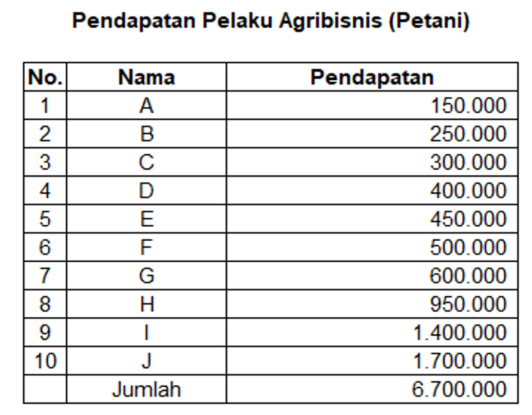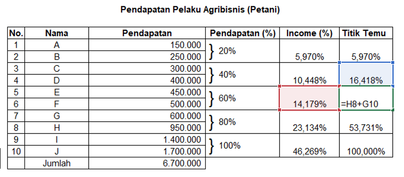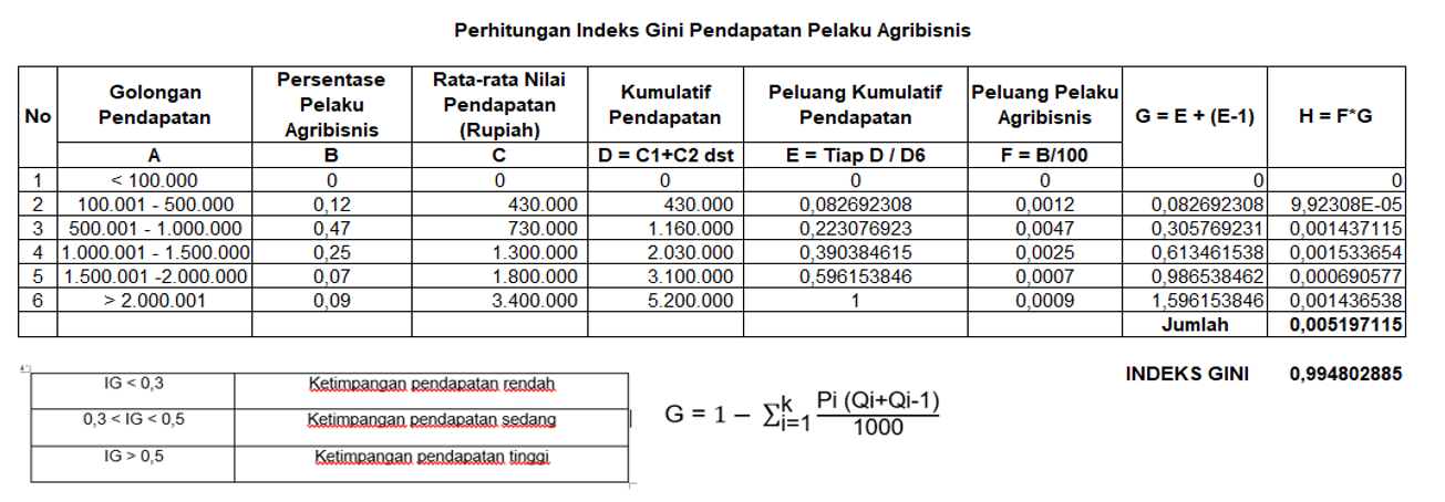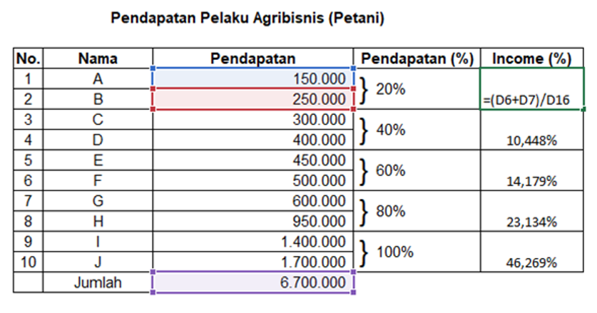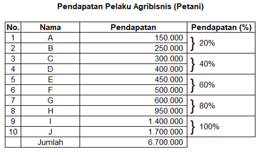However, despite the robustness of the agricultural sector in facing economic shocks and its position as an important sector in Indonesia, it is ironic that in some country rich in natural resources, the life of the farming community is still far from prosperous. Arifin [2], says that 70% of Indonesia's poor are currently farmers. This is contrary to the notion that Indonesia is an agrarian country, but in fact the agrarian fundamental factors are mostly poor. Poor farmers tend to be rural farmers. This causes the emergence of economic inequality in the dimensions of income distribution. Economic inequality in the dimension of income distribution is a reality in the midst of society, both in rural and urban areas and is still an important issue to be addressed. This phenomenon requires an evaluation to be carried out. The evaluation process will be an important indicator in determining future change strategies. The process of improving the quality of community welfare is expected to be followed by improving the quality of society as a whole. One of them is by equitable distribution of people's income in various economic groups.