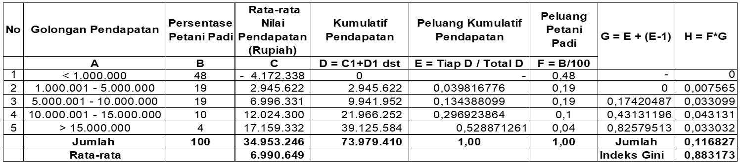 Indonesia is an agrarian country with the agricultural sector playing an important role in the economy. However, farmers' lives are still far from prosperous, causing economic inequality in income distribution. Poverty in Indonesia is a major problem in both rural and urban areas. Data from the Central Statistics Agency as of March 2022 shows East Java as the province with the highest number of poor people. Pacitan Regency is an isolated area with an area of 1,389.92 km2, most of which are barren hills. The Gini ratio measures inequality between rich and poor, with the highest inequality occurring in 2019 and the lowest in 2009. Ngadirojo District is included in the category of class III karst areas that allow mining activities. Inequality in income distribution creates major problems, including increasing fuel tariffs, political stability ahead of the 2024 elections, world political stability, extreme weather and climate change and the haunting recession. The Gini coefficient (Gini Ratio) is used to calculate the income inequality level of 100 sample farmers in Cokrokembang Village. The Gini coefficient (Gini Ratio) through the Lorenz curve graph shows that the income inequality of rice farmers in Cokrokembang Village is quite high. The income of rice farmers from rice farming is below the District/City Minimum Wage (UMK) of Pacitan Regency. The income inequality of rice farmers in Cokrokembang Village reaches 0.88, which is included in the category of high inequality, shown by the widening of the Lorenz curve.
