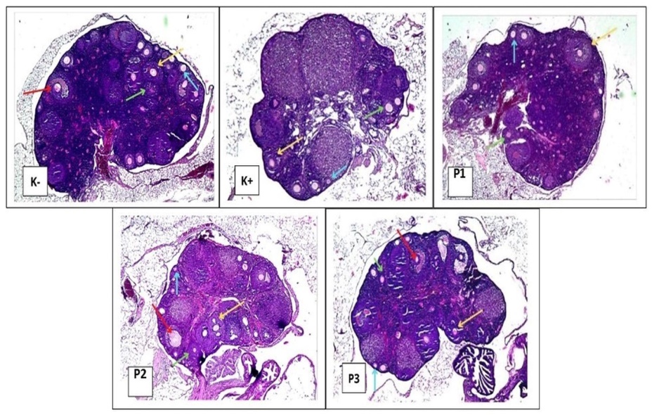 Description: The red arrow (→) indicates the de Graff follicle, the yellow arrow (→) indicates the tertiary follicle, the green arrow (→) indicates the secondary follicle, and the blue arrow (→) indicates the primary follicle. (H.E; Magnification 100x; Nikon Eclipse-E100 light microscope)