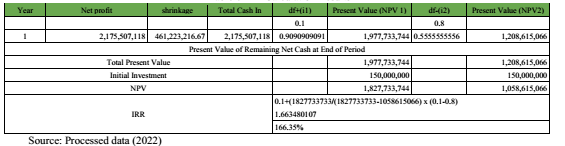 Internal Rate of Return (IRR)is the interest rate that will be the sum of the present value of what is expected and will be received from the sum of the present value of capital expenditures. This study shows that the investment made is feasible because the IRR is 166 %>1.