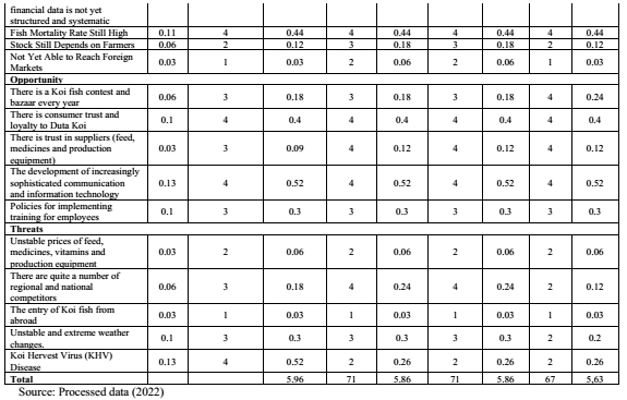 The preparation of the EFE matrix is almost the same as the steps for preparing the IFE matrix. The difference is in the strategic factors included in the EFE matrix, namely the key factors of opportunities and threats that affect the Koi fish business conducted by Duta Koi. Following are the results of the IFE matrix analysis on Duta Koi which can be seen in the Table 10.