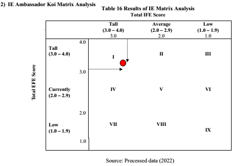 The IE matrix for Ambassador Koi is shown above, the figure shows that the position of Ambassador Koi is in quadrant I, namely having high internal and external capabilities. This position identifies a very profitable position the company has opportunities and strengths. The strategy that must be taken in this position is to support an aggressive policy or growth oriented strategy by taking advantage of existing opportunities and the company's internal strengths [18,19].