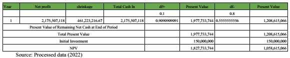 NetPresent Value (NPV), namely the difference between benefits (revenues) and costs (expenses) that have been presented in present value. This criterion says that the project will be selected if the NPV >0. And the NPV calculation results for Duta Koi are 1,827,733,744, the NPV value >0 is positive, which means that the koi fish business is feasible to run.