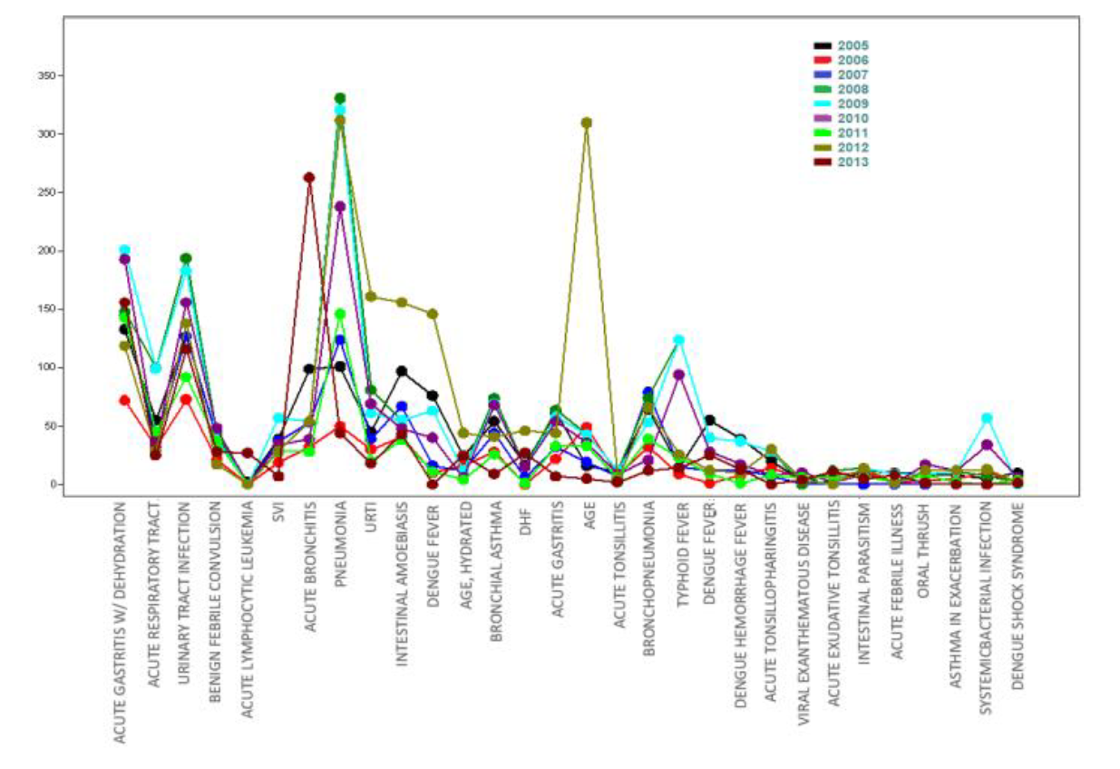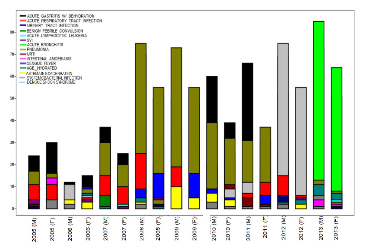 One must take note that the pattern above in figure 1 is the sex-disaggregated data. When data were segregated by sex and by year, the trends changed across age groups and sometimes between males and females. For example, for children aged 1 to 3, Acute gastroenteritis with dehydration outnumbered pneumonia in terms of several documented cases. From 2008, the number of cases of Acute gastroenteritis with dehydration was higher compared to those reported from 2005 to 2007. For this age group, acute bronchitis was also seen highest in 2013.