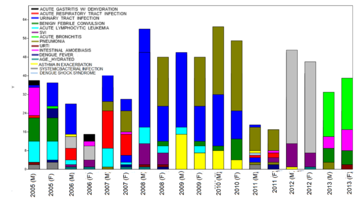 From a long list of the medical records of hospital-admitted children with random ages and diseases, sampling was used for respondents ranging from 1 to 12 years old. The ages were divided into three groups: 1 to 3 y/o (toddler), 4 to 5 y/o (pre-school), and 6 to 12 y/o (grade school). A tabulated form was made to sort all the significant variables available in the data. The gender was grouped into female and male to compare, which has a higher frequency for a particular disease. There are 30 types of diseases found in the list; these are Acute Gastroenteritis with dehydration, Acute Respiratory Tract Infection, Urinary Tract Infection, Benign Febrile Convulsion, Acute Lymphocytic Leukemia, Systemic Viral Infection, Acute Bronchitis, Pneumonia, Upper Respiratory Tract Infection, Intestinal Amoebiasis, Dengue Fever Type 2, Acute Gastritis Hydrated, Bronchial Asthma, Dengue Hemorrhagic Fever Type 3, Acute Gastritis, Acute Gastroenteritis, Acute Tonsillitis, Bronchopneumonia, Typhoid Fever, Dengue Fever, Dengue Hemorrhagic Fever Type 1, Acute Tonsillopharingitis, Viral Exanthematous Disease, Acute Exudative Tonsillitis, Intestinal Parasitism, Acute Febrile Illness, Oral Thrush, Asthma In Exacerbation, Systemic Bacterial Infection and Dengue Shock Syndrome. The number of patients that were diagnosed by these diseases had been tallied in the table manually related to their ages and gender. Below is the tabulated form of the significant variables that were sorted from the original data. The table consists of the total sum of both males and females, ages 1-12 of every diagnosed disease each year. The distribution of the diseases every year were then shown through stacked bar graphs.