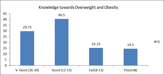 Figure (1) present study 29.75% (119) participants had very good knowledge (16-20 marks) towards Risk Factors and Prevention of Overweight and Obesity, 40.5% (162) had good knowledge (12-15 marks), 15.25% (61) had fair knowledge (8-11 marks) and 14.5% (58) having poor knowledge (<8 marks).