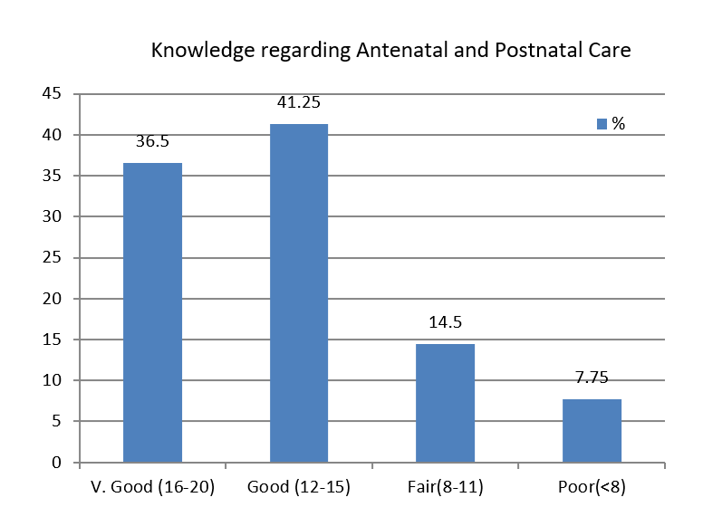 In the present study 36.5% (146) participants had very good knowledge (16-20 marks) towards antenatal and postnatal care, 41.25% (165) had good knowledge (12-15 marks), 14.5% (58) had fair knowledge (8-11 marks) and 7.75% (31) having poor knowledge (<8 marks).
