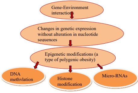 Interconnection of genetic, epigenetic and environmental factors plays important role in development of obesity and its related co-morbidities. Genetic mutation in FTO, leptin, ghrelin, MTHFR genes clearly linked with the incident of obesity. Environment and behaviour (epigenetic) is also clearly linked with obesity. Epigenetic changes do not change the sequences of DNA, they change reading mechanism of DNA sequences and these epigenetic effects are reversible.