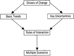 The building blocks for scenario planning include identifying focal issues and key factors, identifying basic trends, identifying key uncertainties and rules of interaction, constructing scenarios, developing multiple scenarios and focusing on relevance, internal consistency, generically different futures and an equilibrium state. The goal is to identify themes that are strategically relevant and organize possible outcomes and trends around them (Figure 3) [20].