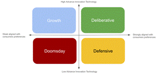 The scenarios are analysed and feasible options are generated to address each scenario, allowing the firm to achieve its objectives in building a sustainable business. Early indicators for each scenario include expert technology innovation, growth acceleration, high product worthiness, new media and commerce channels and strong consumer loyalty.