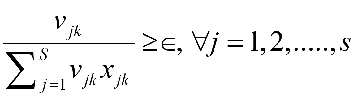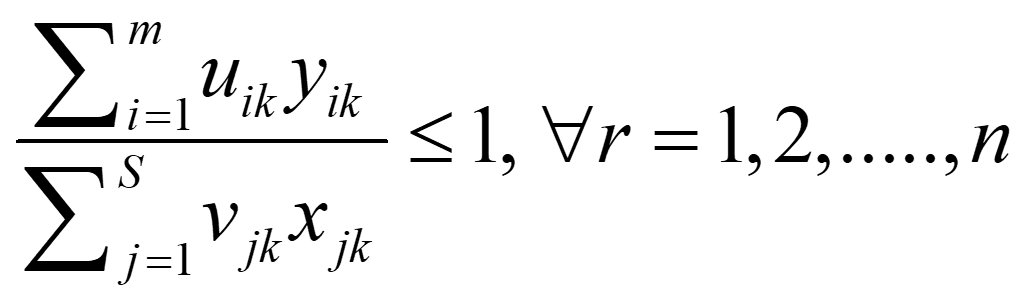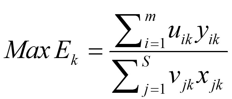 In the above expression, the goal is to find values of uik and vjk to maximize the efficiency of the k-th DMU. This is subject to a constraint that all efficiency measures must be£1. This expression is hard to solve. One way to solve it is to rely on a linear programming model called multiplier form. So, in order to estimate technical efficiency scores based on VRS, a convexity constraint