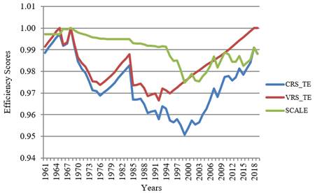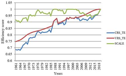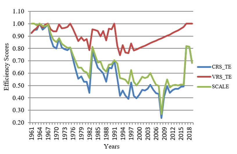 Moving on to Turkey. Table 2 shows technical efficiency scores with CRS and VRS in Turkey between (1961-2019). From the whole study sample, three are found to be overall technically efficient and nine years are pure technically efficient (BCC score = 1). In comparison, the remaining 50 years are relatively inefficient (BCC scores <1). The average PTE is set to be 0.98, which means that given the operation scale, firms can reduce their inputs by 2 per cent of their observed levels without affecting output levels.