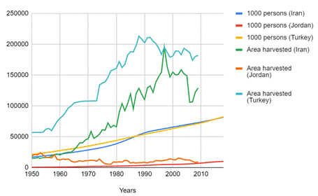 Even though we have three countries leading the production within the MENA region, harvested area and domestic demand had a significant gap between them. Figure 1 shows the trend of harvested area for Turkey, Iran and Jordan compared to the population of these three countries.