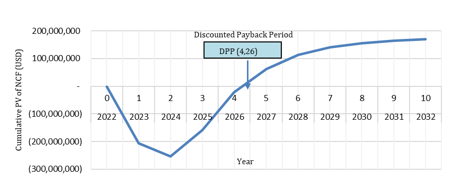 The discounted payback period (DPP) of this project is 4, 26 years which represents the length of time that is required to compensate for the investment of project from cash flow discounted at the discount rate of project. The result of DPP shows that the project is attractive because the time needed to recoup the investment of the project is shorter than the economic lifetime of the project. The Discounted Payback Period method is more stringent than the Payback Period method.