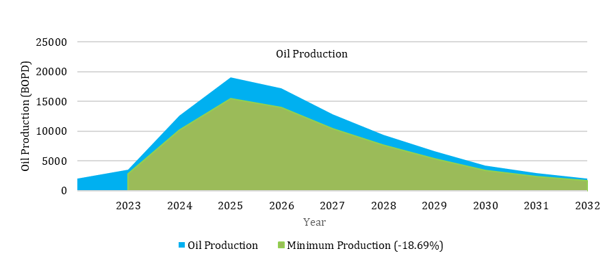 be not decreased below 18.69% from the original oil production. The project is estimated will generate 33.11 MMBO (Million Barrels of Oil) and the minimum oil production of this project that must be produced according to capital budgeting criteria must be 26.92 MMBO (Million Barrels of Oil) or oil production>26.92 MMBO.