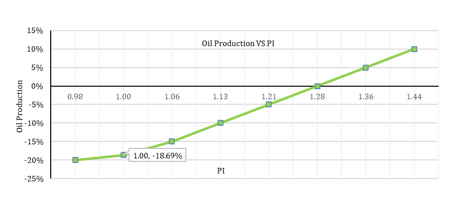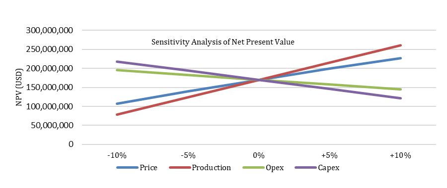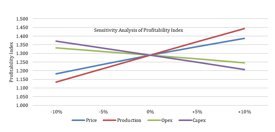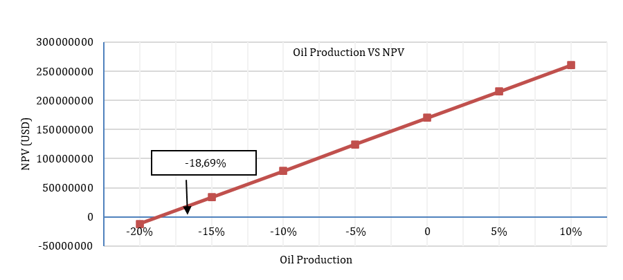 Based on the sensitivity analysis, the net present value is most sensitive to the changes of oil production than other indicator changes. Sensitivity analysis also shown that the profitability index is most sensitive to the changes of oil production than other indicator changes.