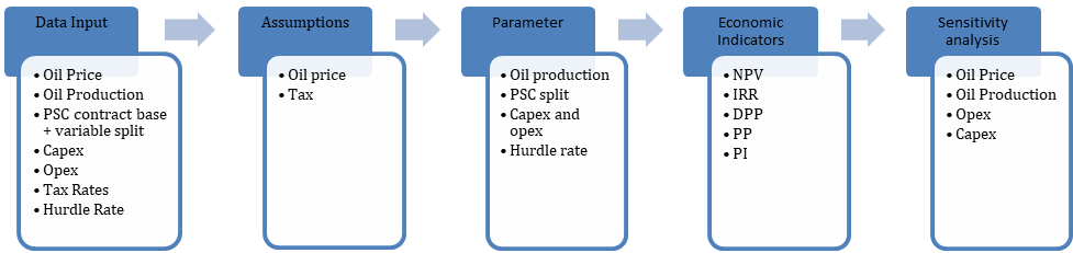 Sensitivity analysis has been conducted to evaluate the resilience of a project if the economic parameters change in the future. In order to do sensitivity analysis, several parameters such as oil price, oil production, opex, and capex is decreased and increased by 5% and 10% (-10%, -5%, +5%, +10%) while the other parameter kept constant to see the influence of parameter changes toward the Net Present Value (NPV) and Profitability Index (PI) of the project. The result of sensitivity analysis is that both NPV and PI are most sensitive to the changes of oil production than other indicator changes.