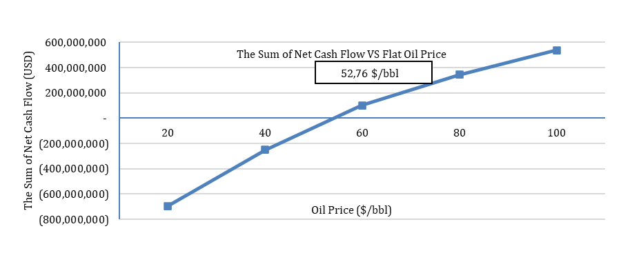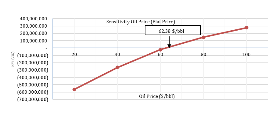 Sensitivity analysis also conducted toward oil prices (flat price) to find the break-even price where NPV = 0. Based on sensitivity oil price, NPV will become zero when the oil price 62,38 $/bbl. When the oil price becomes 62,38 $/bbl (barrel of crude oil), the IRR equal to the discount rate (9,6%). The sum of net cash flow during the project will become zero when the oil price is 52,76 $/bbl.