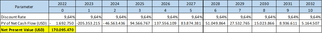 Net Present Value (NPV) of the project is USD 170.095.470. This NPV indicates that the project will give profit to the company PT XYZ and NPV>0 indicates that the project is financially feasible to undertake