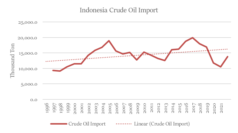 As the development of economy in Indonesia gets more advanced and the population of Indonesia gets bigger, the demand for oil in Indonesia is also increasing. Crude oil is a very important material in Indonesia, and Indonesia still depend on this fossil fuel. Since the supply of oil in Indonesia is below the demand for oil, the Government of Indonesia import oil from other countries to fulfil the demand that makes Indonesia become an oil importing country. The trend line of Indonesia crude oil import is increasing (Figure 2).