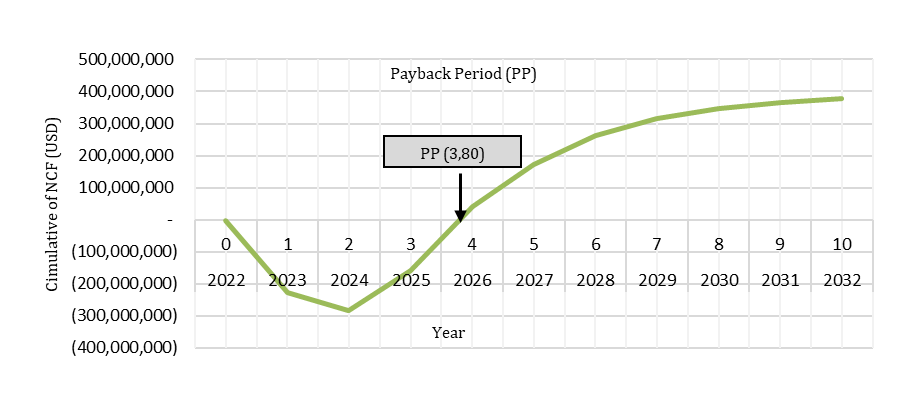 The Payback Period (PP) of this project is 3,80 years, which indicates that the project is attractive because the time needed to recoup the investment of the project is shorter than the 10-year estimated economic lifetime of the project