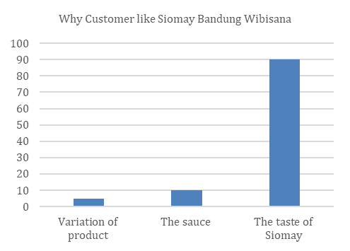 Important keys that can be analyze from the questionnaires are more than 90% from the correspondence like siomay product. Not only siomay is one of well-known traditional product from Indonesian culinary but also the customer like the taste of that product. That’s mean the quality or product taste still the main focus to be assured. The second is even Siomay Bandung Wibisana already establised more than 30 years, still need to improve the awareness through the journey since still many of the correspondence that is not know about the brand. Then the third is meantime most of the customer like the taste of Siomay Bandung Wibisana, but the company need to make sure that they reach out their current customer to do repeating order and also to support customer concern to do repeating order, such as the location and price.