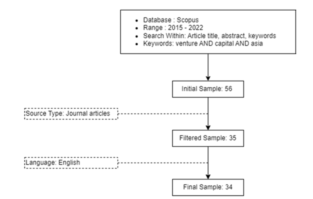 Scopus database information will serve as input for bibliometric analysis. The data spans 2015 through 2022 and includes the terms venture capital and Asia. The search begins inside the article's title, abstract and keywords based on these parameters. Figure 1 for information on the systematic search and filtering procedure. The outcome of this phase is 56 samples. This sample is then filtered with solely journal articles in mind, resulting in a 35 filtered sample. The author attempts to limit these 35 articles to those written in English exclusively. This study's final sample of 34 publications is given in Figure 1.