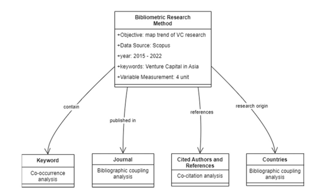 This research use VOS viewer software for bibliometric analysis. Co-occurrence is used to demonstrate which themes are addressed most frequently in VC research in Asia. According to Ding and Yang, co-occurrence may be used to explore present and potential future concerns in more depth. Bibliographic coupling is defined as the unit of coupling between two texts that share a single reference [5]. In this study, bibliographic coupling and descriptive statistics are utilized to determine the most prolific and influential journal for VC research in Asia and the country of origin for each article. Co-citation analysis, the final approach, is utilized to offer information on the most cited author and references in VC research in Asia. This study combines Bibliographic coupling and co-citation since it offers a greater scope of results for bibliometric analysis [6].