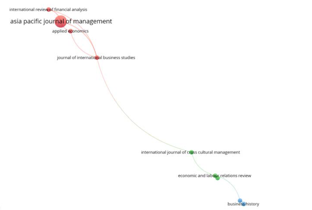 In addition to descriptive data, bibliographic coupling analysis is utilized to determine which journal is the most prolific. Judging on bibliographic coupling, the Asia-Pacific Journal of Management is the most prolific journal. It is determined by the diameter of the circle, as the larger the circle, the greater the number of published papers. Figure 6 depicts the bibliographic coupling analysis findings.