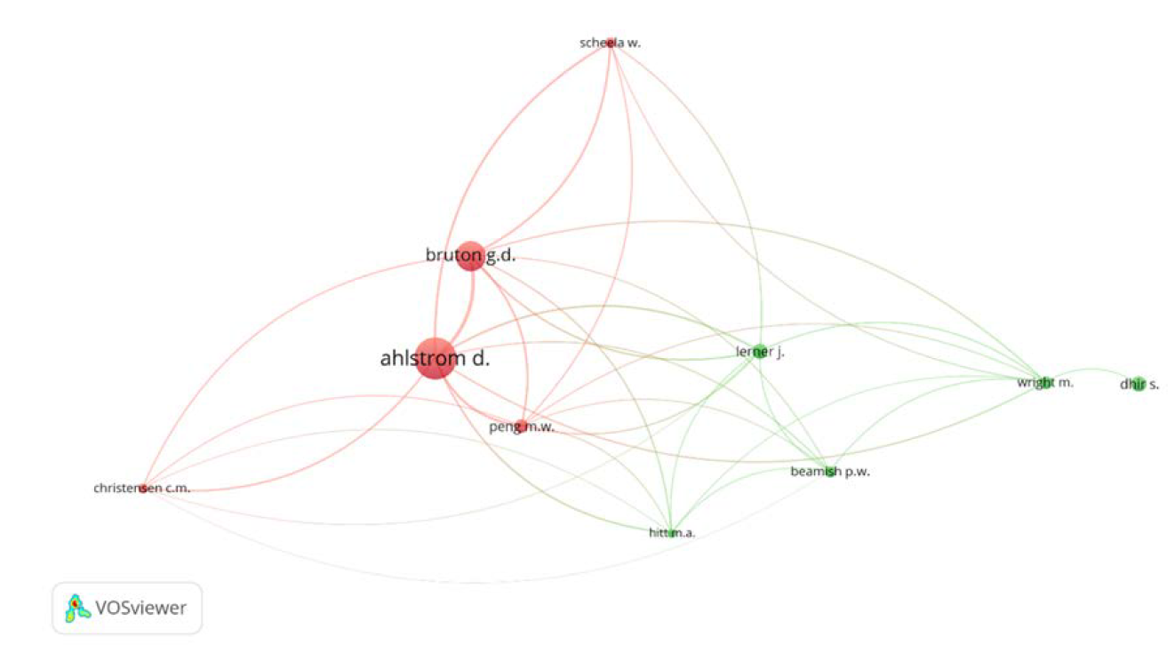According to co-citation analysis, David Ahlstrom (ahlstrom d.) and Garry D. Bruton (bruton g.d.) are the most frequently cited authors in the Asia area for VC research. Ahlstrom d. and bruton g.d. have respectively been cited 77 and 49 times. No other author has received more than 20 citations and none have received more than 50 citations. The red connection between Ahlstrom d. and bruton g.d. indicates that they belong to the same cluster, indicating that they often have a same subject. Figure 7 illustrates the findings of the co-citation study.