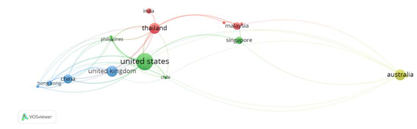 In order to create a map of VC research in Asia, country of origin is equally crucial information. The article's country of origin might be determined through bibliographic coupling. As a result, the United States is the only nation to have contributed almost six articles or more. The United Kingdom, Australia and Thailand, which are ranked second, have each published five articles. Thailand seems to be the only country in Asia to generate the greatest number of articles pertaining to emergent venture capital research in Asia. In comparison to Asian countries, non-Asian countries have conducted a greater amount of research on venture capital in the Asia-Pacific area. Figure 8 displays the bibliographic coupling results.