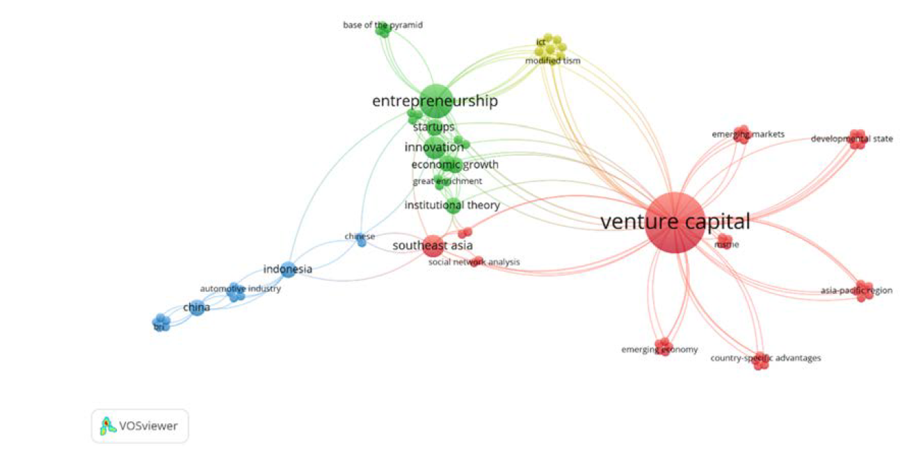 As a followed up from co-occurrence analysis in this section the researcher will elaborate on each cluster. There are 4 cluster as a result from co-occurrence analysis which is Venture Capital in Emerging Economies-Southeast Asia, Entrepreneurship and Innovation, Venture Capital and International Business and Sustainable Finance and Environmental Responsibility (Table 3).