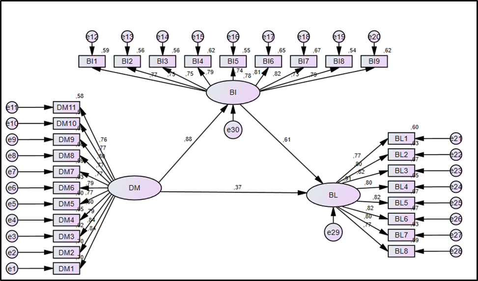 D.M (Digital Marketing), B.I (Brand Image), B.L (Brand Loyalty)