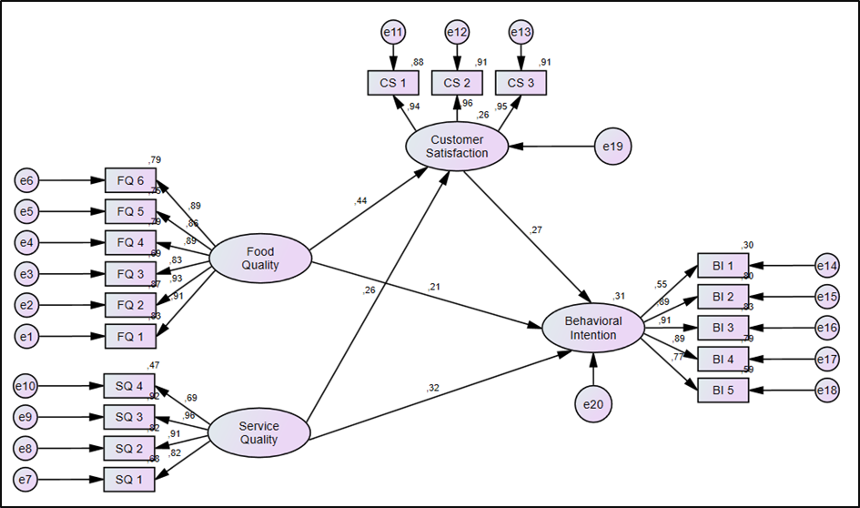 | Food Quality --> Customer Satisfaction --> Behavioral Intention | 2,85 | 0,004 |