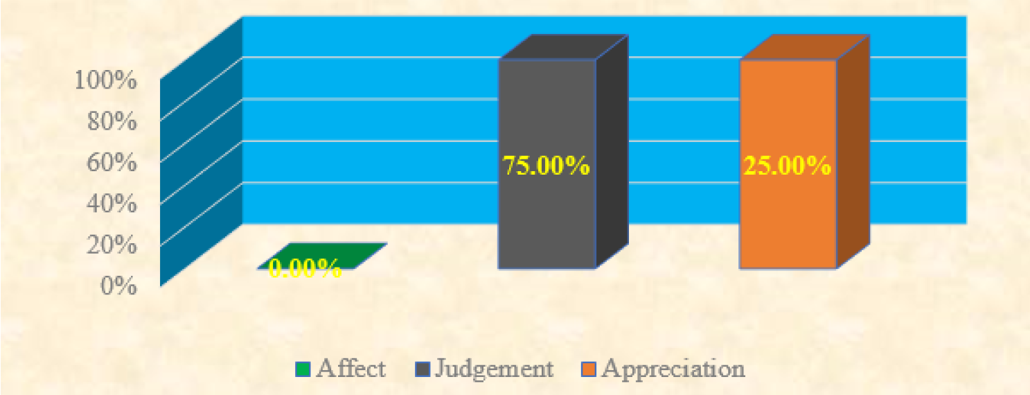In line with Marin and White’s [16], framework, the classification of attitude and its subsections of affect, appreciation and judgement are quantitatively analyzed in Table 2. These frequencies are characterized in the Figure 2.
