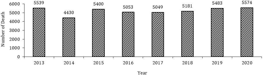 Between 2013 and 2020, at least 41,709 persons have lost their lives to road crashes in Nigeria (Figure 1).
