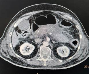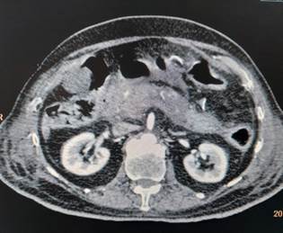 of abdomen (Figure 1) showed bulky/ enlarged and heterogenous pancreas with non-enhancing necrotic areas within it. Tail is poorly visualized (likely necrotic). Peripancreatic fat stranding with peripancreatic fluid is noted – features suggestive of acute necrotizing pancreatitis. As a routine protocol for admission in intensive care unit during this covid era, her nasopharyngeal and oropharyngeal swab was sent for COVID-19 testing by reverse transcriptase polymerase chain reaction (RT-PCR) which came out to be positive. Diagnosis of acute viral pancreatitis, COVID-19 induced, was kept. She was admitted in COVID-19 isolation ward and treated symptomatically with bowl rest, intravenous fluids, analgesia and empirical antibiotics. She was managed conservatively and discharged in hemodynamically stable condition after 1 week.
