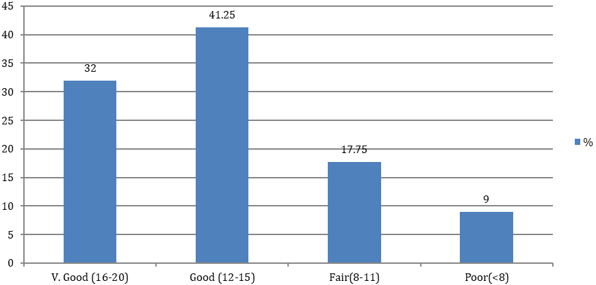 Questionnaire: The questionnaire contains 20 structured knowledge related questions. One mark was given for each correct answer and zero for incorrect answer. The maximum score was 20 and minimum score was zero. Scoring was done on the basis of marks as >80%(16-20)=very good,60-79%(12-15) =Good,41-59% ( 8-11)=Fair,<40% (< 8)=poor